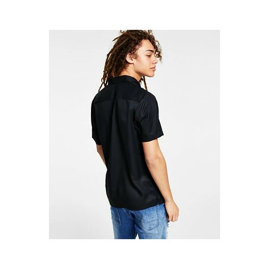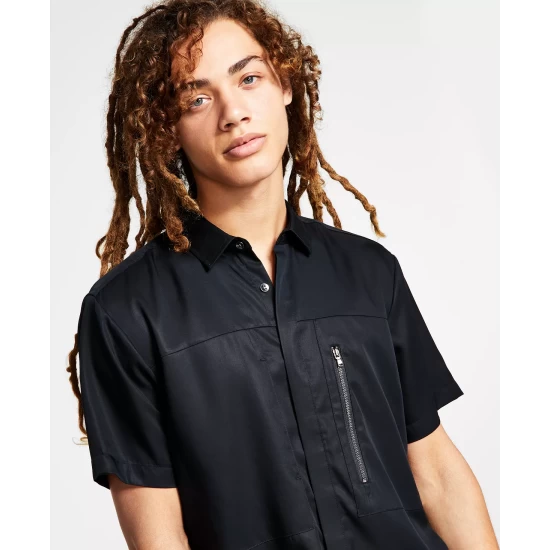 A classic button-down gets a stylish update with the vertical zipper pocket place at the chest of this breezy shirt from I.N.C. International Concepts®.