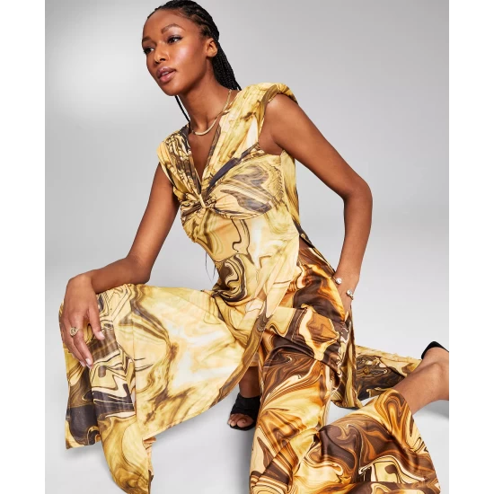 Bold bodycon ruching and power shoulders top the free-flowing tone of this marble-print side-slit maxi top from Jeannie Mai X INC International Conceptsยฎ.