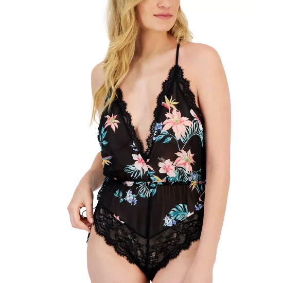 Chiffon printed bodysuit with lace detail from Inc International Concepts, with adjustable straps.