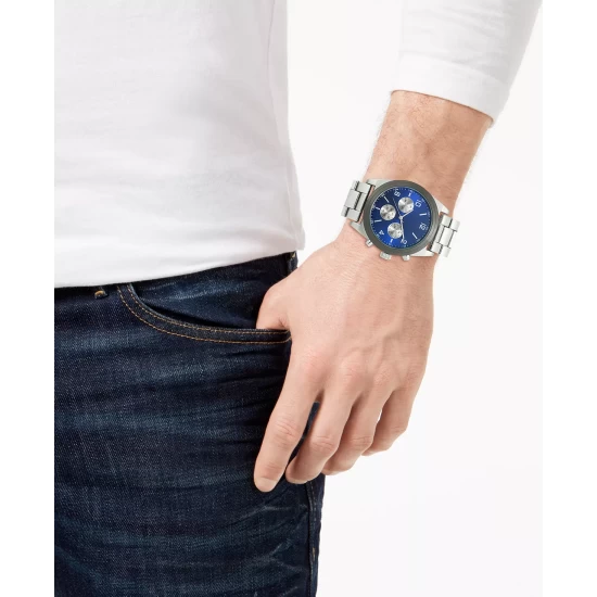 I.N.C. International Concepts designed this large silver-tone timepiece with a gleaming blue dial offering the look of a chronograph with three balanced silver-tone accents.