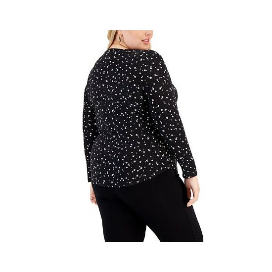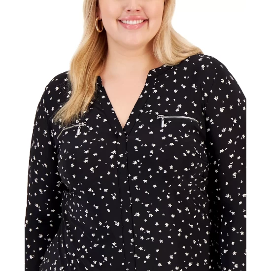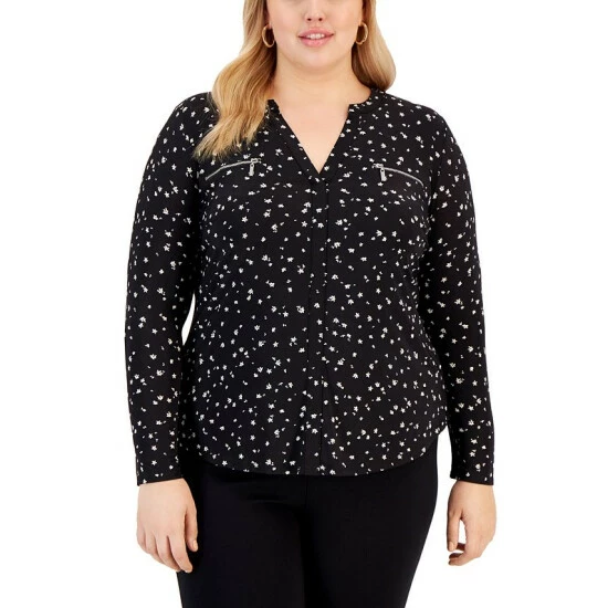 A pretty floral print and zip-detail pockets create a stylish look with this plus size top from INC International Concepts.