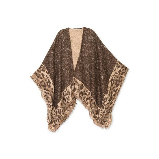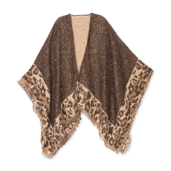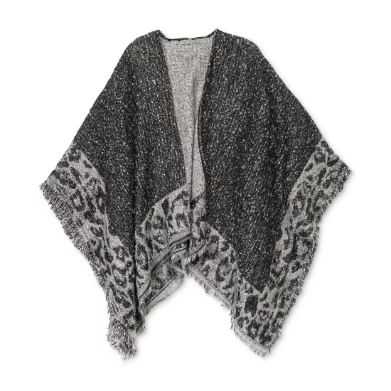 This cozy wrap from INC International Concepts is a fun alternative to standard neutral toppers, taking bold animal-print and showcasing it tamely as a border, and incorporating sequins, for a surprising pop that can still play as casual.