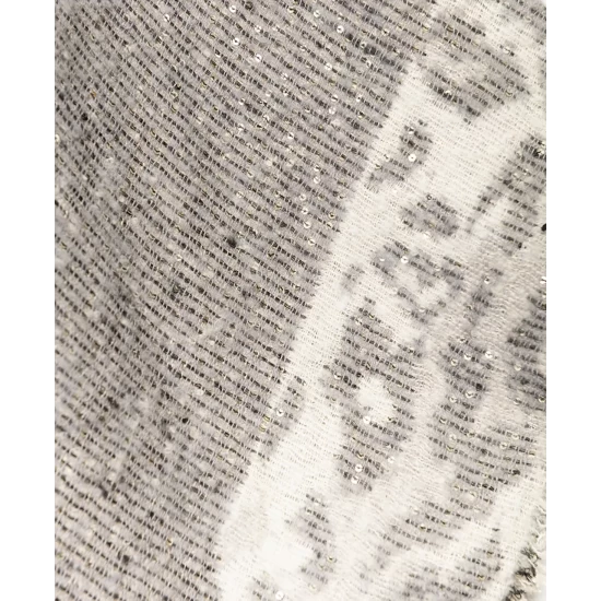- Style Details: Open front; animal-print and fringe detail along hemline; sequin-embellished