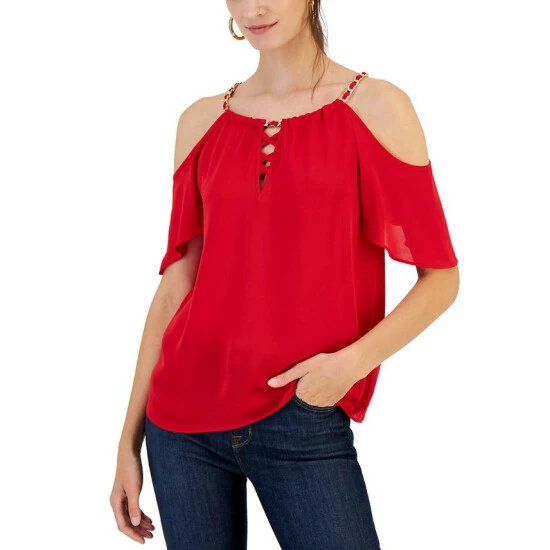 Accented with a chain-neck detail, this cold-shoulder top from INC International Concepts will elevate your wardrobe.