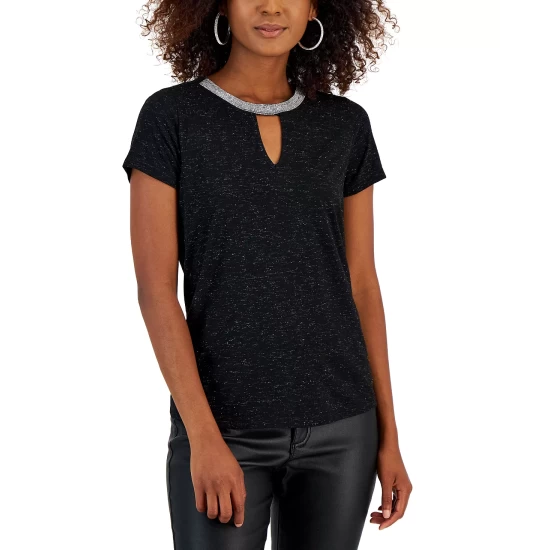 An embellished neckline adds dazzling style to this keyhole top from INC International Concepts.
