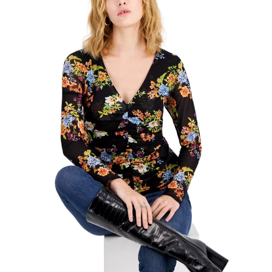 Designed with a ruched center, this floral-print V-neck top from I.N.C. International Conceptsยฎ is the perfect addition to your wardrobe.