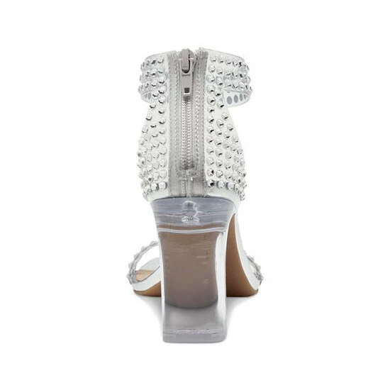 - Square-toe ankle-strap sandals with back zipper closure