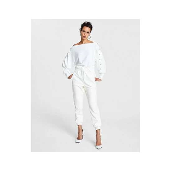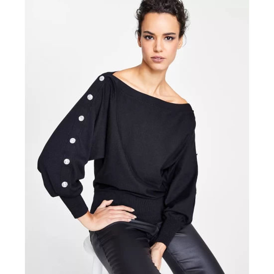 INC International Concepts® presents a knock-out look in this sweater, with a daring off-the-shoulder neckline and bold decorative buttons.